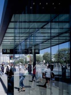 Beide Zugangsbauten bestehen konstruktiv aus rechteckigen, geschweißten Hohlkastenträgern, deren U-Form die Brückenanmutung erzeugt. An diese Stahlbügel sind horizontale Zwischenträger angebracht, die die gläsernen, jeweils oben und unten beziehungsweise innen und außen angebrachten Dach- und Rückwandverkleidungen halten. Diese mit einem abstrakten Tropfenmotiv bedruckten Glasscheiben korrespondieren mit der Glasoberfläche eines ebenfalls von Poitiers entworfenen Restaurantpavillons auf der anderen Straßenseite. Es sind diese durchscheinenden Glasflächen, die einen Großteil des Reizes der Bahnhofseingänge ausmachen: Sie tauchen den halboffenen Innenraum in ein diffuses, blaugrünes Licht mit weichen Schatten; der Bahnhofszugang wird wunderbar als ein indifferentes Niemandsland zwischen Unterwelt und Himmelreich inszeniert. Man befindet sich gleichsam in einer »twilight zone«, einem Zwischenreich, wo das Licht in Schatten übergeht, der offene in den geschlossenen Raum. Auch die in dem Hohlraum zwischen den Scheiben verborgene Beleuchtung streut weich und unterstreicht den nicht fassbaren Charakter des Raumes.