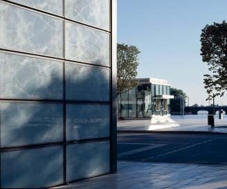 André Poitiers schafft es, diese Atmosphäre mit einer ganz und gar rationalen, klaren Architektur zu erzeugen, die in Richtung Ingenieurbauwerk tendiert. Die Raffinesse ihrer Details beeindruckt: So ist jede einzelne Scheibe mit wenigen Handgriffen zur Reinigung oder beim Lampentausch aufklappbar und bei Beschädigung rasch auszutauschen. Damit die Großform nicht verunklart wird, sind alle Schrauben und Halterungen hinter Blenden oder in Fugen verborgen. Selbst die Entwässerung des Daches erfolgt unsichtbar in den Stahlträgern.