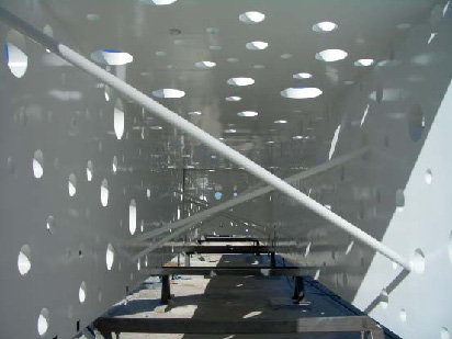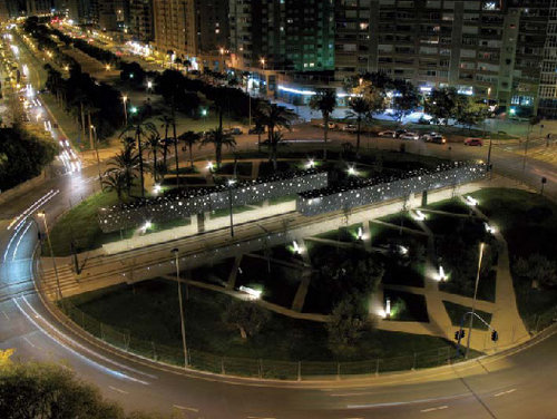 Die 36 Meter langen Metallstränge sind durchstanzt von unzähligen Löchern unterschiedlichster Größe, die neben funktionaler auch konstruktive Bedeutung haben. Sie spenden tagsüber Schatten im heißen Klima der Küstenregion, sind durchlässig für leichte Brisen und leuchten des Nachts durch »tanzend« diagonal im Inneren angeordnete Neonröhren.