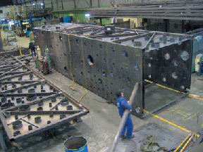 Die Lastverteilung gelingt über ein komplexes Zusammenspiel: Die Oberflächen der doppelwandigen Scheiben sind auf Fachwerkträgern befestigt. So konnte die notwendige Queraussteifung der Boxen minimiert werden. Außerdem werden zur Aussteifung auch die Laibungen der Löcher herangezogen: Ihre Ränder sind jeweils mit der inneren und der äußeren Stahlplatte biegesteif verbunden. So erklärt sich, dass die Anzahl der Löcher dort am höchsten ist, wo die größten Lasten auftreten. Für zusätzliche Stabilität sorgen schlanke, diagonal im Luftraum der Körper befestigte Stabstähle.