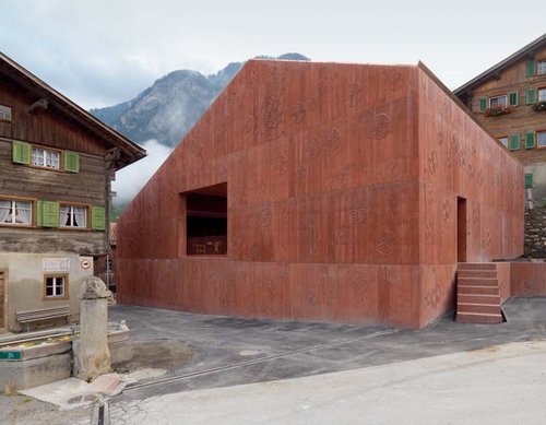 Ein eher massiv anmutender Baustoff, eine eigenwillige Farbgebung und ein sehr filigranes Schmuckelement sind die herausragenden Gestaltungsmerkmale eines »Hauses« in Scharans, das eigentlich kein Haus ist. Die Replikation von Formen und Ornament führt zu einem eindrücklichen Gebäude, das vielfach les- und nutzbar ist und seine Komplexität aus der Einfachheit erhält.