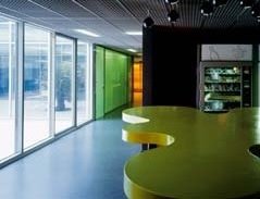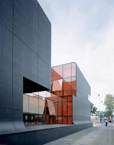 Entgegen des verschlossenen Eindrucks, den das Gebäude von außen vermittelt, öffnen sich im Inneren ständig Ausblicke auf den Betriebshof, und fast alle Räume sind durch Blickbezüge mit dem Außenbereich in Verbindung gesetzt. Die Anzahl der sich bietenden Perspektiven wird zudem durch eine Verspiegelung der in das Gebäudevolumen eingeschnittenen Glasflächen vervielfacht. Diesen Effekt erreichen die Architekten durch in engem Raster hinter die Verglasung aufgebrachte silberne Punkte. Die zudem quadratisch unterteilten Glasfassaden, stellen eine ironische Interpretation der typischen Achtziger-Jahre-Fassade der umgebenden Gewerbebauten dar.