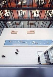 Wie weit die baulichen Veränderungen tatsächlich gehen, wird nach dem Eintreten deutlich. Sobald die schwere Kupfertür des Haupteingangs – eines der Wahrzeichen des Verlags – elektrisch aufschwingt, wird der Blick in den Lichthof frei: Beeindruckend hell und großzügig ist das vollständig entkernte Gebäude mit dem lichtdurchfluteten Atrium. Bis zur vierten Etage erheben sich Galeriegeschosse mit Sichtbeton-Brüstungen – die Materialwahl soll absichtlich in starkem Kontrast zu den Baumethoden und verwendeten Materialien von vor 100 Jahren stehen. Die Decke besteht aus einem Betonraster mit 18 aufgesetzten Betonelementen in Pyramidenform, deren Spitze abgeschnitten und durch Glas ersetzt wurde.