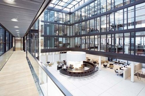 Der Mäander des Gebäudes – den man beim Durchlaufen desselben allerdings nur bedingt wahrnimmt – legt sich um vier glasüberdeckte Atrien. Sie gliedern das Gebäude zum einen in funktional einander zugeordnete Verwaltungsbereiche, zum anderen sollen sie durch ihre Gestaltung die Orientierung im Inneren erleichtern: Jedem Atrium ist eines der Elemente Holz, Luft, Wasser und Stein zugeordnet, das sich beispielsweise in der Möblierung oder, im Fall des Wassers, einem Brunnen widerfindet. Inspiriert sei dieses Konzept von spanischen Landschaften.