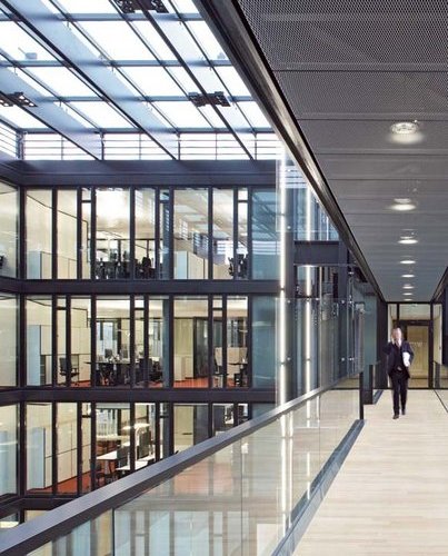 Thermisch sind die Atrien von den Innenräumen getrennt – erstere sind Mittler zwischen Außen- und Innenklima. Eine Fußbodenheizung erwärmt sie im Winter auf minimal 17 °C, Lüftungsklappen sorgen für den notwendigen Luftaustausch. In den Büros findet ein zweifacher Luftwechsel statt, Heizung und Kühlung werden über Konvektorenheizungen respektive akustisch wirksame Abhangdecken mit Quellluft-auslässen sichergestellt. Doppelböden sorgen für die Verteilung der technischen Installationen, durch die allseitige Verglasung fällt ausreichend viel Licht auch in die Kernbereiche der Etagen, das durch Sonnenschutz-lamellen und innen liegende Rollos dosiert werden kann.