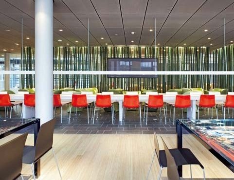 das Platz für 250 Gäste bietet. Die Mitarbeiter können hier wählen, in welchem Ambiente sie ihre Mittagspause verbringen möchten. Die Interieurs bewegen sich zwischen japanisch-minimalistischem Design und dem noblen Charme eines »fine dining«. Die Bereiche werden im offenen Grundriss durch Raumteiler voneinander getrennt.