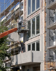 Der südliche Riegel entlang des Gedser Rings sollte dagegen gänzlich neue Balkone direkt über den Hauseingängen erhalten. Da die Fassade ohnehin bereits stark durch Vorsprünge und Loggien gegliedert war, entschieden sich die Planerinnen gegen komplett vorgestellte – und vergleichsweise leicht zu realisierende – Stahlbalkone, die als fremdes Element die Heterogenität des Ensembles noch verstärkt hätten. Stattdessen wählten sie eine einfache wie intelligente Kragkonstruktion aus Stahlbetonfertigteilen, die sich gut in die Gebäudeansicht einpasst und weitgehend in das etwa zehn Zentimeter starke, neue Wärmedämmverbundsystem aus Polystyrol-Hartschaum eingebunden wurde.
