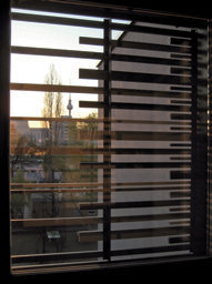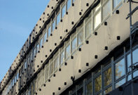 Das Hauptaugenmerk aber galt natürlich den Längsfassaden. Die Brüstungen des Typenbaus bestehen aus Betonsandwichelementen mit Innendämmung. Erste Maßnahme war, die Elemente von unten anzubohren und für das Kondenswasser Abflussröhren einzubauen. Die alten Fenster sind durch neue Holzfenster in derselben Teilung von 1,20 Metern ersetzt und außen dunkel gestrichen. Auf die Fassadenplatten wurden – ebenfalls außen – eine 15 Zentimeter starke Mineralfaserdämmung und schwarzes Windpapier aufgebracht. Zehn Zentimeter vor dieser schwarzen Fläche „schwebt“ eine zusätzliche, elementierte Aluminiumfassade. Sie besteht aus eloxierten, rechteckigen Hohlprofilen von fünf verschiedenen Breiten und vier verschiedenen Farben in einer holzartigen Farbpalette, die abwechselnd in horizontalen, über die gesamte Gebäudelänge laufenden Streifen montiert sind. Jeweils ein Fassadenfeld von 4,24 Metern Länge wurde mit L-förmigen Schienen zu einem vorfabrizierten Element zusammengefasst und in die Unterkonstruktion aus Aluminiumwinkeln und U-Profilen eingehängt. Der Abstand zwischen den 20 bis 100 Millimeter breiten Streifen ist mit 2,5 Zentimetern so gewählt, dass Selbstreinigung gewährleistet ist, ein Besteigen der Fassade jedoch verhindert wird. Unerwünschte Graffiti oder Farbschmierereien lassen sich dank der Eloxalschicht mit Spezialreinigern entfernen, ohne dabei die Oberfläche zu verletzen. Größtes logistisches Problem war das Sortieren der Streifen nach Plan, größte Herausforderung am Bau die präzise Montage, denn schon die geringste Unregelmäßigkeit würde deutlich ins Auge fallen.