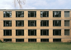 Bei den Internatswohnhäusern war ein zweiter Rettungsweg notwendig. Der Mittelteil der Fenster sollte als Drehflügel ausgebildet werden, was die Optik der Profile verändert und beeinträchtigt hätte. Da haben wir gesagt: Ist es nicht denkbar, wie in einem Bus ein Hämmerchen neben das Fenster zu hängen, mit dem im Notfall die Scheibe eingeschlagen werden kann? Schließlich ist es so realisiert worden, mit einer mittleren, fest eingesetzten Scheibe aus Sekuritglas.