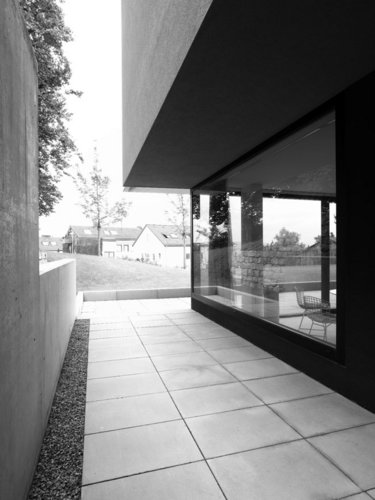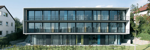 Der Neubau wurde in bevorzugter Aussichtslage an einem Südhang realisiert. Das Baugrundstück befindet sich in einem Wohngebiet, dessen bauliche Struktur mit freistehenden Einfamilienhäusern aus den frühen 1960er-Jahren stammt. Der Bauherr hatte das 1250 Quadratmeter große Grundstück mit einem bestehenden kleinen Einfamilienhaus geerbt und beabsichtigte, es selbst zu bebauen und die entstehenden Flächen zu vermieten. Die privilegierte Lage, der hohe Wert und die durch den bestehenden Bebauungsplan schlechte Ausnutzungsmöglichkeit des Grundstücks schlossen eine dichte Bebauung mit verhältnismäßig kleinen Wohnungen aus. Um die Möglichkeiten und Chancen für die Planung auf dem Wohnungsmarkt im Vorfeld zu klären, wurde gemeinsam mit dem Bauherrn das Profil einer künftigen Nutzung erarbeitet, dem die Gebäudestruktur des Neubaus Rechnung tragen sollte. Als Zielgruppe wurden gestaltungs- und qualitätsbewusste, eher leistungs- als preisorientierte Mieter definiert. Um möglichst vielen familiären Strukturen und Wohnformen auch in 30 Jahren noch gerecht zu werden, sollten die Wohnungen auch zu einem späteren Zeitpunkt durch nicht tragende, demontierbare Trennwände veränderbar sein. Um die Flexibilität der Flächen nicht einzuschränken wurden die vertikalen Erschließungselemente hangseitig aus der rechteckigen Grundrissfläche ausgerückt. Im Untergeschoss befindet sich die Tiefgarage mit insgesamt 10 Stellplätzen, das Erdgeschoss beinhaltet die wohnungsnahen Keller-, Wasch-, und Technikräume. Abgetrennt durch einen Flur schließt sich nach Süden ein verglastes Band mit etwa 160 Quadratmeter Wohnfläche an. In den beiden Obergeschossen sind in jeder Ebene zwei Wohneinheiten mit je 140 Quadratmeter, alternativ jeweils eine Einheit über 280 Quadratmeter Wohnfläche möglich. Vom Lofttyp bis zur Wohnung mit fünf Räumen sind alle Grundrisstypen herstellbar. Innerhalb der offenen Grundrissfläche wurden im nördlichen Bereich zwei kubische »Servicezellen« angeordnet, die alle notwendigen Installationen beinhalten. Das Untergeschoss und der erdüberdeckte Teil des Erdgeschosses wurden in Beton-Massivbauweise errichtet. Die Obergeschosse wurden als Mischkonstruktion teilweise mit tragenden, horizontal aussteifenden Außenwänden und -wandscheiben, teilweise als Skelettkonstruktion erstellt.