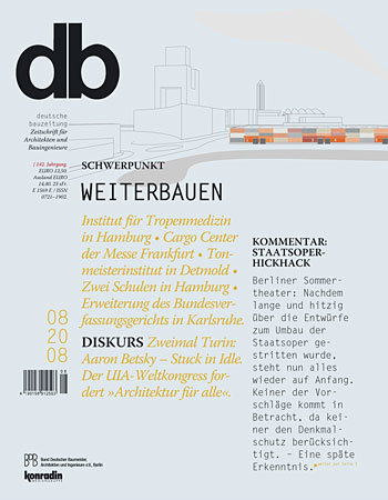 Das neue Cargo Center setzt die Tradition der Messe Frankfurt fort, durch Architektur von hoher Qualität die Identität des Messestandortes zu stärken und somit einen Mehrwert für Aussteller, Messebesucher, die Stadt Frankfurt und nicht zuletzt für sich selbst zu schaffen. Das Gesicht der Messe war bislang mit Bauten von Oswald Matthias Ungers, Helmut Jahn und Nicholas Grimshaw alles andere als blass, doch das Cargo Center von Kölling Architekten zeigt, wie glücklich sich ein starkes Farbspiel in dieses kraftvolle Architekturensemble einfügen kann.db, Mi., 2008.08.06