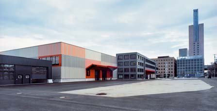 Die anthrazitfarbene, glatt geschliffene Putzfassade des auf der Ostseite der Halle angefügten Verwaltungstraktes hebt sich klar ab. Sie greift zwar das Anthrazit der Fassadenprofile und Tore sowie in den Fensterlaibungen das Material Blech wieder auf. Doch die Höhenstaffelung der Lochfassade scheint nicht mit der Halle zu korrespondieren. Insbesondere die Fensterbrüstungen nehmen keine erkennbaren Bezüge zur vertikalen Gliederung der Lagerhalle auf. Unter funktionalen Gesichtspunkten hingegen sind Halle und Verwaltungstrakt sehr gut aufeinander bezogen. Die Architekten setzen hier das Konzept der kurzen Wege bei geringem Flächenverbrauch konsequent um. Der viergeschossige Bürotrakt spannt sich als Torhaus über den abgesenkten Ladehof und schafft auf diese Weise einen geschützten Vorbereich für die Anlieferung. Die Waren werden hier entweder zwischengelagert oder direkt über die Tore auf der gegenüberliegenden Seite auf dem Messegelände verteilt.
