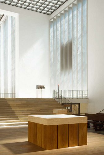 Was tun, wenn das Kirchenbauwerk groß, doch die Zahl der Gemeindemitglieder klein ist? Der Einbau einer Werktagkapelle ist eine zeitgemäße Antwort. Sie schlägt zwei Fliegen mit einer Klappe: Zum einen bietet sie als kleinerer Raum einen intimen Rahmen für die weniger stark frequentierten Gottesdienste unter der Woche, zum anderen reduziert sich durch ihren Einbau auch die Größe des Hauptraums, so dass auch beim Sonntagsgottesdienst die Bankreihen voller wirken als zuvor. Und – banal, aber wichtig – die beiden Räume lassen sich je nach Bedarf getrennt heizen, so dass sich die Betriebskosten reduzieren. Denn in Zeiten sinkender Mitgliederzahlen, also schwindender Finanzkraft, müssen die knappen Mittel sehr gezielt eingesetzt werden. Ein Architekt, der einen Umbau plant, trägt daher immer eine hohe Verantwortung: Trifft er die falschen Entscheidungen, schnellen später die laufenden Kosten für das Gebäude in die Höhe. Geld, das dann für die sozialen Aufgaben der Kirche – von Jugendarbeit bis Seniorenbetreuung – fehlt.