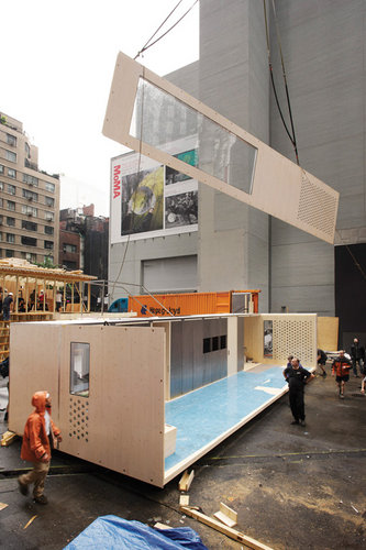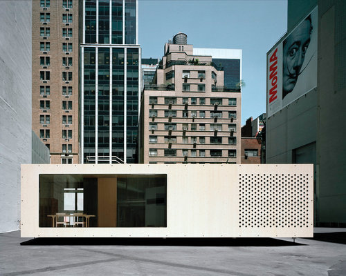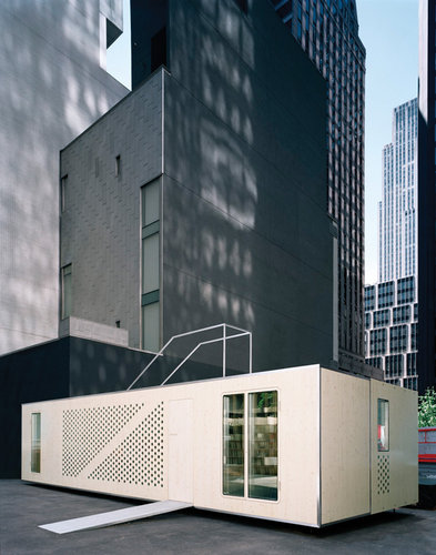 Um 13.30 Uhr steht das in sämtlichen konstruktiven Teilen aus Brettsperrholz gefertigte system3-Haus samt Maß-Möblierung schlüsselfertig an seinem Platz. Als Exponat der Ausstellung »Home Delivery: Fabricating the Modern Dwelling« lotet es als einer von fünf internationalen Beiträgen im Maßstab 1:1 die konstruktiven Möglichkeiten der Vorfabrikation aus. Der MoMA-Kurator Barry Bergdoll knüpft damit an eine Tradition des Hauses an, denn im Skulpturengarten des Museums sind schon mehrmals Musterhäuser aufgestellt worden (1949 eines von Marcel Breuer), um den uniformen Trashhomes der amerikanischen Vorstädte eine architektonisch relevante Alternative entgegenzustellen. Dass Architekten wie Jean Prouvé, Le Corbusier, Walter Gropius, Buckminster Fuller, Richard Rogers etc. gegen den Mainstream der Fertighausindustrie schwer ankamen, zeigen auch die rund 80 ausgewählten Prefab-Systeme, die im historischen Teil von Home Delivery ausgestellt sind. Das Dilemma zwischen Fertigungsökonomie und individualisiertem Endprodukt machte vielen Konstrukteuren zu schaffen, erschwingliche Häuser vom Fließband, die sich mit den Qualitätsstandards der Autoindustrie messen könnten, blieben allzu häufig Projekt. Dass sich durch computergesteuerte Fertigungstechniken diesbezüglich neue Möglichkeiten eröffnen könnten, ist eine der Thesen des New Yorker Ausstellungsprojekts.