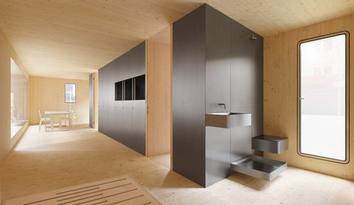 Die 10cm dicken Massivplatten des 53 m² umfassenden MoMA-Prototyps – mit größeren Wandstärken kann problemlos Niedrig- oder Passivhausstandard erreicht werden – wurden außen mit einem Bootslack geschützt, innen sind die Oberflächen geölt. Dem richtungsneutralen Kräfteverhältnis der Massivholzplatte entsprechend können die Wände CNC-gesteuert an beliebiger Stelle perforiert, das »Schnittmuster« der Fenster und Öffnungen somit individuell programmiert werden. Die handwerkliche Ausführungsqualität (flächenbündige Materialanschlüsse, auf Gehrung geschnittene Kanten) des vorfabrizierten system3-Prototyps mag nicht nur New Yorker Ausstellungsbesucher erstaunen. Die Modularität des Systems erlaubt zudem eine etappenweise Erweiterung oder Veränderung, es darf nachträglich verkettet und gestapelt werden: »Ein zusätzliches Gästezimmer, zehn zusätzliche Hotelzimmer oder 200 zusätzliche Quadratmeter Bürofläche – alles ist möglich.«