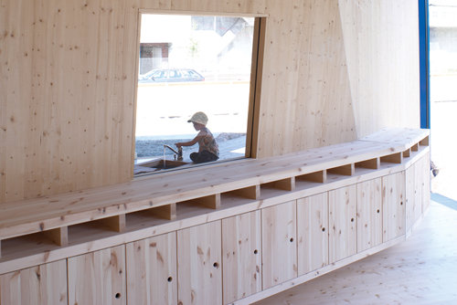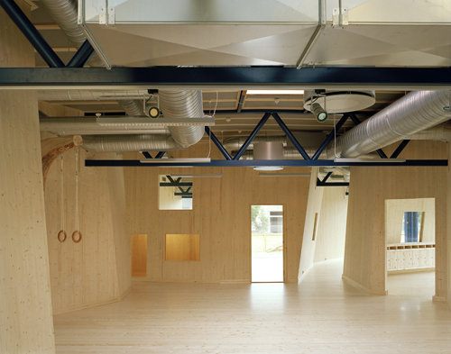 Das neue »Grundelement« ist nun konsequenterweise die Platte, nicht mehr der Stab. Sie besteht aus drei und mehr Lagen kreuzweise verleimter Schichten von Schnittholz. Dieses »Überkreuz-Verweben« verleiht ihr hohe Festigkeit und Steifigkeit und damit statische Scheibenwirkung. Sie ist richtungsneutral oder besser »richtungsindifferent« und kann theoretisch in beliebiger Dimension endlos produziert werden. Diese Voraussetzungen wirken sich im aktuellen Holzbau aus: Platten-Tektonik und dünnwandige Scheiben verhalten sich im Massstab 1:1 wie Kartonage, als ob ein Kartonmodell in die Dimension eines Bauwerks transponiert worden wäre. Das betrifft nicht nur die physische Wahrnehmung. Offensichtlicher wird dies beim Umgang mit Öffnungen: Scheinbar beliebig in die Scheiben gestanzt oder aus ihnen herausgeschnitten, wie mit dem Cutter aus dem Karton, wird die unglaubliche Resistenz der Platten-Tektonik am Bauwerk sichtbar.
