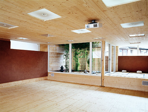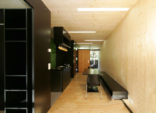 Im Anschluss daran schlug die Stunde der Wahrheit: Mit dem Entfernen der provisorischen Tragkonstruktion nahmen die Holzboxen die ihnen zugedachte Position ein – ihre gesamte Last wurde nach und nach auf die Außenmauern übertragen. Eine Doppelfunktion kommt den Seitenwänden des zentralen Treppenlaufes zu: Aufgrund der Fähigkeit von Brettsperrholz, auch diagonale Kräfte aufzunehmen, fungieren diese zugleich als Handlauf und als statisches Aussteifungselement. Neben den konstruktiven Vorteilen kam die naturbelassene Oberfläche des Fichtenholzes dem Wunsch des Bauherrn nach einer umweltbewussten Bauweise in hohem Maße entgegen. Die Rohheit des Materials und die Echtheit der Konstruktion verleihen dem Innenraum einen natürlichen und unaufdringlichen Charakter. Hervorzuheben sind auch die unkomplizierte Bearbeitung und gestalterische Flexibilität des Holzbaustoffs während des gesamten Bauprozesses. Entscheidungen über die Positionierung von Wandnischen und Fensteröffnungen fielen großteils erst vor Ort in Absprache mit dem Bauherrn und der ausführenden Firma. Drei Freibereiche krönen den baulichen Abschluss der dominierenden Raumzelle: Straßenseitig erstreckt sich ein Balkon über die gesamte Breite der Box, hofseitig eine Dachterrasse. Unter dieser verbirgt sich als exotisches Schmuckstück ein japanischer Garten. Von hier aus ragt meterhoher Bambus durch einen Holzrost aus feinen Lärchenlamellen, der zugleich »Gartendecke« und Terrassenboden ist, nach oben.