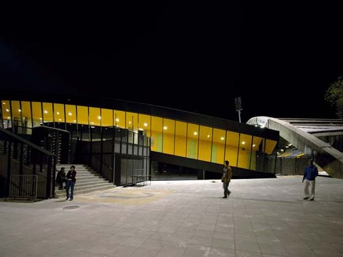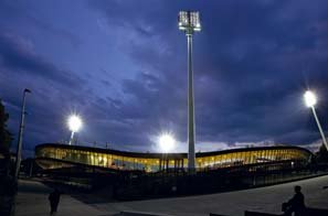 Dabei wurde mit einem ganz wesentlichen Teil der Anlage noch gar nicht begonnen: Unter den Tribünen wurde auf ¬einem ober- und einem unterirdischen Geschoss Raum geschaffen für einen Fitnessclub mit Schwimmbecken, Läden, Gaststätten und vier Sporthallen, die man in der Stadt dringend braucht – die nebenan gelegene, 2006 eröffnete Sporthalle Lukna steht bisweilen unter Wasser, weil der darunter liegende Kanal zu knapp bemessen wurde. Man scheint dennoch Zeit genug zu haben, schließlich brauchte es vom Wettbewerb bis zum bespielbaren Stadion allein schon zehn Jahre …