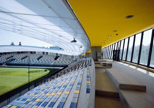 Dieser Ausgestaltung liegt die Entscheidung zugrunde, an jenen Stellen mit guter Sicht mehr Sitzplätze anzubieten als an denen mit ungünstigem Blickwinkel. Daher wurden die Hauptzugänge in die Ecken gelegt und die Zahl der Sitzreihen dort reduziert. Zentral über dem Spielfeld steigen die meisten Sitzreihen hintereinander auf, und die Dachschwünge erreichen hier jeweils den höchsten Punkt. Im Rücken der Tribüne verläuft als ein zentrales Element des Entwurfs ein durchgehender Umgang, von dem aus alle Plätze erreichbar sind. Beginnend auf Rasenniveau, neben den Auflagerpunkten des alten Tribünenbogens, folgt der Umgang dem Auf und Ab der Tribünenränder und ermöglicht es, frei im gesamten Neubau umherzugehen. Dieser konzeptionellen Durchlässigkeit entspricht auch die Offenheit der Konstruktion: Die Betonpfeiler, auf denen das Dach ruht und von denen aus die weit auskragenden Stahlträger abgehängt sind, fassen jeweils paarweise einen der Zugänge zum Tribünenraum ein. Im Gesamtbild treten sie kaum in Erscheinung und lassen das Dach schwebend erscheinen, zumal die Hinterwand des Umgangs völlig verglast ist und keinerlei Einbauten oder Brüstungen den Blick behindern. Zusammen mit der zweischaligen Dachhaut aus transluzenten Polycarbonatplatten, die nachts von innen beleuchtet werden, entsteht ein offener, heller und sehr heiterer Eindruck – die liebliche Hügellandschaft der Untersteiermark tut dazu ihr Übriges. Diesem luftigen Eindruck können auch die kräftigen Vereinsfarben – Violett und Sonnengelb – nichts anhaben, die sich in großflächigen Plakaten, Beschriftungen und vor ¬allem in den Schalensitzen wiederfinden. Hier ist der mächtige Einfluss des Fußballklubs zu spüren, der das ursprünglich als Sport- und Kulturstätte für ganz Maribor errichtete Stadion mehr und mehr für sich zu vereinnahmen trachtet. Letztlich ist das auch legitim; zwar flossen Gelder aus Töpfen von Stadt (sechzig Prozent), Verein (vier Prozent) und dem EU-Fonds für regionale Entwicklung (36 Prozent); der noch lange nicht abgeschlossene Ausbau ist jedoch nur mit Sponsorengeldern zu bewerkstelligen – und die wird man weniger durch ein freundliches Wesen als vielmehr mit fernseh- und somit werbewirksamen Sportveranstaltungen in der obersten Liga erwirken. Es fehlen bislang die Bestuhlung der allerobersten Sitzreihen und die zweite Glasschale, die den Umgang zu einem rundum windgeschützten Bereich aufwerten soll.