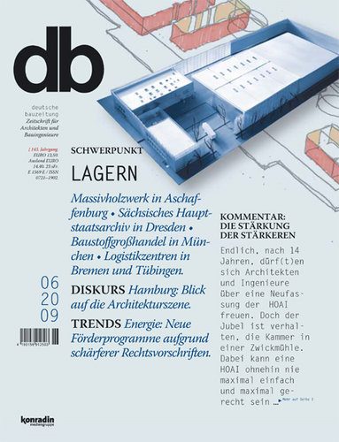 Subtil ist insbesondere die Unterteilung der Fassade in fünf übereinander »gestapelte« Schichten, deren Höhe von unten nach oben zunimmt (von etwa zwei auf vier Meter). Dies hat wiederum keinen konstruktiven Bezug zum Innenraum, ergibt aber eine reizvolle scheinperspektivische Verkürzung der Bauhöhe. Der variierende Glimmer-Anteil der Lackierung entmaterialisiert die Fassade zusätzlich. Diese Finessen und die geschickte Gliederung der Baumassen auf engem Grund trugen dem Gebäude im vorigen Jahr eine Auszeichnung »guter Bauten« des Bundes Deutscher Architekten ein. Das Logistikzentrum sei »wegweisend für intelligenten Industriebau«, heißt es in der Begründung.db, Do., 2009.06.04