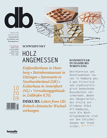 Man sieht: Dieses kleine, außergewöhnliche Wohnhaus ist nicht etwa einer gestalterischen Obsession seiner Architekten entsprungen. Es ist die perfekte Umsetzung einer neuartigen Vorstellung des familiären Zusammenlebens in einem Einfamilienhaus, das zusammen mit den Nutzern und den Tragwerksplanern entwickelt wurde. Dafür wurde ein höchst effizientes und zudem kostengünstiges Tragwerk ausgetüftelt, für das einzig der Werkstoff Holz in Betracht kam. Dass dieses Haus auch noch die Ressourcen schont, ein natürliches Wohnklima schafft und recyclingfähig ist, zeigt, dass eine gute Gestaltung und ökologisches, nachhaltiges Bauen überhaupt kein Widerspruch sein müssen. Es ist eine im backsteinernen Norden ungewöhnliche Kiste aus Holz und Glas, doch sie wird Schule machen – das ist gewiss.db, Mi., 2009.10.07