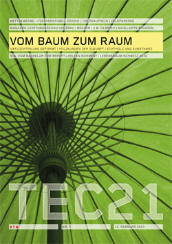 «Holz ist gemütlich», weiss der Volksmund. Daher erstaunt es nicht, wenn Häuslebauer vom eigenen Chalet träumen. Doch auch bei vielen Menschen, die sich an der elterlichen Wohnwand sattgesehen und vom Durchschnittsgeschmack vermeintlich losgesagt haben, löst Holz positi-ve Emotionen aus: Designbewusste kaufen verkratzte Bistrotische, Aussteiger richten sich in umgebauten Scheunen ein, Bankenkunden erwarten mit Edelfurnier verkleidete Tresen. Die haptischen und ästhetischen Qualitäten von Holz bedienen offenbar unterschiedlichste Sehnsüchte – welche dies sind und wie die Holzbauindustrie darauf zu reagieren gedenkt, ist Gegenstand der Forschung (S. 37ff.). Auch materialtechnisch er-weist sich Holz als verblüffend wandlungsfähig: Es eignet sich nicht nur für traditionelle Bauweisen, sondern auch für modernen Systembau, computergestützte Fertigung oder die Herstellung holzbasierter Hybridwerkstoffe (vgl. TEC21 11/2008, 8/2009, 3-4/2010). Selbst in ausgefallensten Formen wirkt Holz wohltuend vertraut.