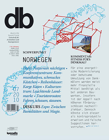 Zwischenzeitlich wurde ein ausgezeichnetes Wohlfahrtssystem eingerichtet und die UNO benannte im letzten Herbst in ihrem Bericht über die Entwicklungsstandards ihrer Mitgliedsstaaten Norwegen als das Land mit der höchsten Lebensqualität. Seit einiger Zeit macht nun auch eine junge Architekturszene von sich reden, die mit ihren Entwürfen viel Gespür für Ort und Landschaft beweist und mit klaren räumlichen Aussagen die traditionelle Naturverbundenheit der Norweger zum Ausdruck bringt – vor allem im Rahmen kleinerer Projekte entlang der offiziellen Touristenstraßen. Aber auch in Oslo, wo sich das Großstadtleben mehr und mehr entwickelt, brechen mit dem Ausbau ehemaliger Industrieareale zu neuen Büro- und Wohnvierteln neue Zeiten in der Stadtentwicklung heran. Es entsteht das Bild eines modernen Staates, doch muss man beim Blick hinter die Fassaden erkennen, dass die lokale Bauwirtschaft noch nicht das Niveau der südlichen Nachbarländer erreicht hat, und da man sich – solange das Erdöl sprudelt – über energetische Fragen keine Gedanken machen muss, gewinnt das nachhaltige Bauen in der öffentlichen Wahrnehmung nur langsam an Bedeutung. Statt des üblichen db-Ortstermins werden wir am 20. September in der Königlich Norwegischen Botschaft zu Berlin eine Vortragsveranstaltung über norwegische Architektur anbieten. Über das Programm und die Veranstaltungsdaten werden wir zeitnah informieren. | Achim Geissinger