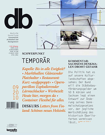 Sie machen neugierig, faszinieren und provozieren, prägen nur vorübergehend den Stadtraum, sind Zwischenlösung oder Platzhalter, ungewöhnlich und oft experimentell, mobil und demontabel – und bis man sie vollends wahrgenommen hat, auch schon wieder verschwunden. Traumartig mögen temporäre Bauten daher manchen Menschen im Gedächtnis bleiben. Aus der Erinnerung an ein solches entstand u. a. die Idee für dieses Heft: Das Foto links zeigt einen Gebäudeausschnitt des »STRUDEL«, einen nicht mehr existierenden Veranstaltungspavillon von stoosarchitekten, die diesen für die Dauer der zehntägigen »Badenfahrt 2007« aus Recycling- bzw. Baumaterialien wie Schalungsträgern und -brettern, Latten und Gerüstbohlen errichten ließen. Dabei kamen alle Baumaterialien ohne Zu- und Verschnitt in ihren Ursprungsgrößen zum Einsatz, nur so konnten sie komplett wiederverwendet werden. Bei den im Anschluss vorgestellten Projekten hatten der Aspekt des Modularen und des Recyclings zwar nicht immer Priorität, doch gewannen dafür andere Anforderungen an Bedeutung, schließlich müssen (oder mussten) sie teilweise einer längeren Nutzungsdauer und weitaus anspruchsvolleren Nutzungen standhalten. Dadurch kann auch aus so manch temporär geplantem Gebäude ein dauerhaftes werden, wie das ein oder andere Projekt in diesem Schwerpunkt zeigt. Aber sehen Sie selbst … | Christine Fritzenwallner