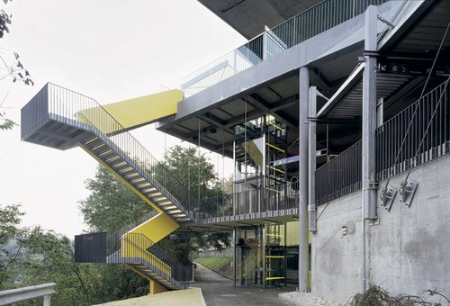 Die Stahlkonstruktion trägt in beiden Richtungen und auch im Verbund mit dem Überbeton. Die vielen schiefen Winkel und schrägen Anschlüsse waren in Stahl eher kompliziert (speziell im Bereich der Liftöffnung) und teuer. Die ganze Konstruktion in Beton auszuführen wäre billiger gewesen. Dann aber hätte das höhere Gewicht den Hang, in dem die Fundamente stehen, zu stark belastet bzw. wäre die Fundation entsprechend viel teurer geworden.