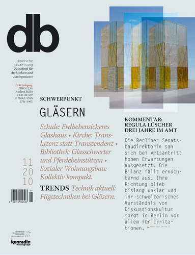 Glas ist ein faszinierender und zugleich ambivalenter Baustoff. Er bietet einerseits hohe gestalterische Vielfalt, verlangt aber andererseits nach besonders sorgsamem Umgang. Richtig eingesetzt lohnt sich der oft vergleichsweise hohe planerische – und nicht selten auch finanzielle – Aufwand allemal, denn wie kein anderer Baustoff erfüllt Glas die elementaren Bedürfnisse des Menschen nach Tageslicht und nach visuellem Kontakt zur Umgebung jenseits der Gebäudehülle. Der ständig wechselnde Ausdruck des Glases im Spiel mit dem Licht ruft zudem reizvolle Sinneseindrücke hervor und erzeugt im Stadtraum sich laufend wandelnde architektonische Bilder. Im Schwerpunktteil und in der Rubrik »Technik aktuell« der November-Ausgabe zeigen wir anhand von ganz unterschiedlichen Anwendungen die gestalterischen Möglichkeiten – aber auch deren Grenzen – sowie die technischen Neuerungen des Werkstoffs auf.