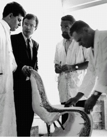 Ein Stuhl in vier Versionen Pantons formal und konstruktiv gewagte Stuhlidee hatte sich also realisieren lassen. Trotz dieses Erfolgs bestand jedoch kein Grund, sich mit dem Erreichten zufrieden zu geben. Das Verfahren, in dem die erste Version des Stuhls hergestellt wurde, war aufwändig und teuer. Der Stuhlrohling musste nach dem Pressen in Handarbeit gespachtelt, geschliffen und lackiert werden. Die Produktion größerer Stückzahlen, mit der sich die bald abzeichnende Nachfrage hätte befriedigen lassen, konnte so nicht bewältigt werden. Panton selbst störte neben dem erheblichen Gewicht des Stuhls seine nicht ganz ebenmäßige Oberflächenstruktur.