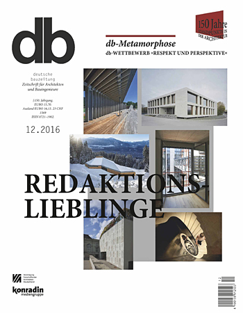 Zum Abschluss des Jahres laden wir Sie wieder zu einer Entdeckungsreise zu den Lieblingsprojekten der Redakteure ein. Alle Projekte stellen wir Ihnen dabei unter dem gewohnt architekturkritischen Blickwinkel der db vor. Folgen Sie uns auf den nächsten Seiten u. a. zu dem wahrscheinlich radikalsten Schweizer Wohnungsbauprojekt der letzten Jahre, zur Erweiterung des Stadtmuseums von Aarau, zu einem bemerkenswert schlichten Verwaltungsgebäude in Besigheim sowie zum Umbau einer alten Skifabrik im Schwarzwald in eine Pflegeeinrichtung für Kinder. Wir wünschen eine anregende Reise! | Die Redaktion