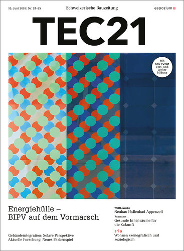 Dieses Heft widmet sich zum einen den Möglichkeiten von gebäudeintegrierter Photovoltaik (BIPV) im Rahmen von Stadterneuerungsprozessen, zum anderen den technischen und ästhetischen Fragen, die es in diesem Bereich zu beantworten gilt. Architekten, Wissenschaftler und Hersteller versuchen gemeinsam, eine neue Ausdrucksform für BIPV zu entwickeln und ihr so zu breiter Akzeptanz zu verhelfen. TEC21 hat sich bereits in den Ausgaben 46–47 und 48/2017 mit der Thematik befasst.