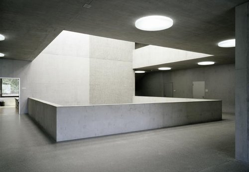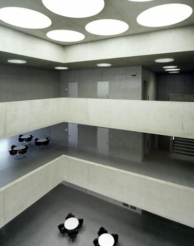 Einen Kontrapunkt zum kantigen Beton setzen die runden Oberlichter der Halledecke und die ebenfalls runden Leuchten auf den Galerien; mit mattem Glas gedeckte, violett schimmernde Öffnungen im Hallenboden weisen darauf hin, dass auch im Untergeschoss etwas los ist. Die gestockten und die schimmernd gestrichenen Betonwände leiten über die Treppen nach unten in den Gymnastik- und Kraftraum, dessen professionelle Ausrüstung die Bedeutung illustriert, die die Schulleitung dem Sport zumisst. Nun löst sich auch das Rätsel des violetten Lichts, das durch die fünf runden Oberlichter in die Halle schimmerte: Auf dem Boden liegt ein dunkelvioletter Belag.