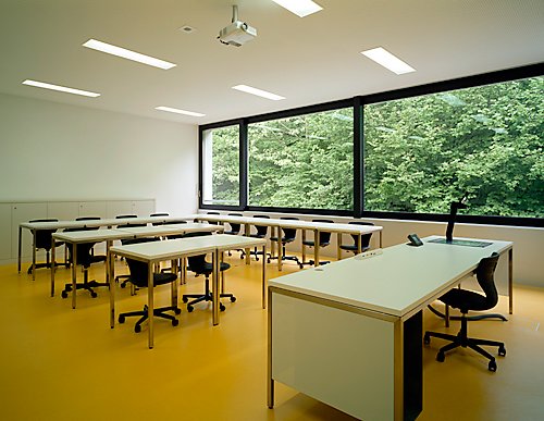 Eine andere, lichtere Stimmung als in der kargen kantigen Halle herrscht in den Unterrichtszimmern, deren Wände und Decken in Weiss strahlen und auf deren Boden ein gelber Linoleum liegt. „Wir wollten ein neutrales Gefäss schaffen“, erläutert Bettina Neumann die Absicht der Architektinnen. Alle Zimmer sind identisch gestaltet, einzig durch ihre Grösse unterscheiden sie sich - die Informatikzimmer sind etwas grösser als die Klassenzimmer, die Gruppenräume etwas kleiner. Trotz der einheitlichen Farben und Oberflächen ist die Atmosphäre in jedem Raum anders, je nach dem, ob vor dem schwarz gerahmten Fenster der Wald aufragt oder sich die Weite der Stadt ausbreitet. Während des Unterrichts sind die beiden Welten von Halle und Zimmer hermetisch voneinander getrennt. Während der Pause jedoch, wenn die Türen geöffnet sind, überträgt sich dank dem gelben Boden die heitere Raumatmosphäre auch auf die Halle, die dann vom Leben der pausierenden Schülerinnen und Schüler erfüllt ist.