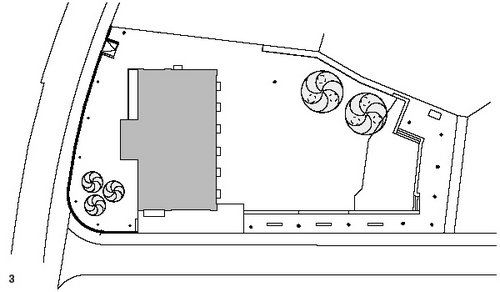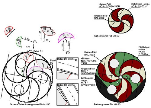 Die Idee, eine runde Form zu wählen, entstand allerdings nicht aus dem Gedanken Schutz gleich Schirm, sondern aus dem Wunsch, der statischen Fassade des Baus etwas Bewegtes gegenüberzustellen, das mit den Bogen der Fenster einen entfernten formalen Bezug eingehen würde, ohne sich anzubiedern. Aus diesem Gedanken der Bewegung entstand auch die Form der Rippen, die sich als Kreissegmente um die Stütze drehen und so wie Propeller die Schirme anzutreiben scheinen.