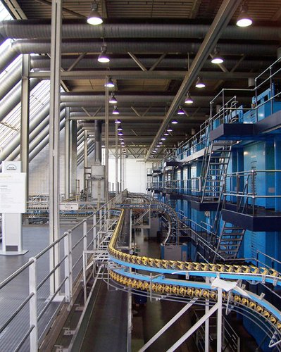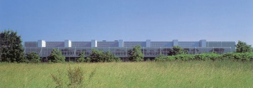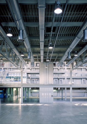 Die vom Grundstück vorgegebene Ausrichtung des Volumens in Ost-West-Richtung ließ sich mit den zwei geplanten Rotationsmaschinen sinnvoll nutzen. Diese Maschinen, ein Fluchttunnel als Fundament und eine über eine Schrägverglasung natürlich belichtete, nur durch Treppenhäuser unterbrochene Verbindungstrasse bilden das Rückgrat des Gebäudes. Der streng modulare Aufbau der klassischen Stahlfachwerkkonstruktion bietet den erforderlichen Spielraum für die übersichtliche Positionierung der Maschinen und die Möglichkeit der Erweiterung an den äußeren Enden der Anlage. Von dieser Möglichkeit wurde bereits im Jahre 1994 mit Erfolg Gebrauch gemacht.