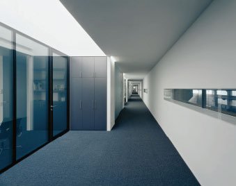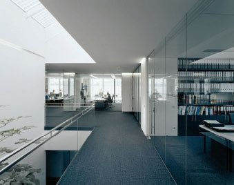 Im Innern der neuen Büroetage ist die Offenheit der Fassade über die gesamte Raumhöhe erlebbar. Regalborde vor den Glaselementen dienen als Ablageflächen und machen gesonderte Absturzsicherungen unnötig. Die gesamte Innenraumgestaltung wurde sehr diszipliniert ausgeführt und wirkt dennoch nicht aseptisch. Glastrennwände sind rahmenlos in die grauen Filzböden gesenkt, weiße Wandscheiben von etwa einem Meter Breite rhythmisieren die Zimmerfluchten, das Grün von Gläsern und Pflanzen spiegelt sich im Metall von Profilen und Handläufen wider. Wo der Architekt gerne kompromisslose Betontreppen in die Stiegenhäuser eingestellt hätte, nutzte der Bauherr eine weitere Gelegenheit, seine Kompetenzen vor Augen zu führen, und verwendete mit weißen Punkten bedruckte Glastritte.