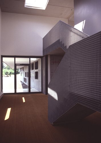 Das schnörkellose Gebäude beruht auf einer einfachen und pragmatischen Entwurfshaltung. Für das kreative Treiben im Inneren sollte ein schlichtes Gehäuse entwickelt werden. Nur der farbig gehaltene Sonnenschutz in Rot- und Orangetönen verrät etwas von der gelassenen Heiterkeit hinter den lang gezogenen Bullaugen. Ein eingeklappter Rücksprung im Erdgeschoss gibt den Zugang zu der »schwarzen Festung« preis.