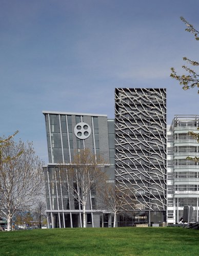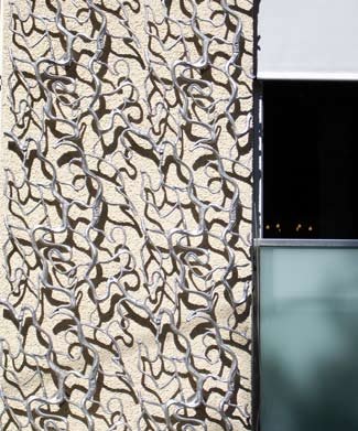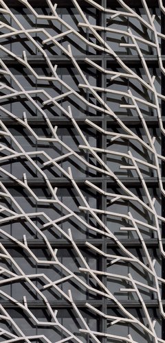 Die an gefrorenes Eis auf Glasscheiben erinnernde Struktur erzeugt durch ihre richtungslosen Fasern« eine reflektierende visuelle Haut, deren Muster die Orthogonalität der Fassadenelemente bricht und sie mit einem abstrakten Rauschen überlagert.