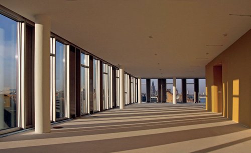Die Innenseiten der geschlossenen Elemente lassen sich zusätzlich mit Akustikpaneelen oder Kühlelementen bestücken, um so auch erhöhte Komfortansp rüche berücksichtigen zu können. Die vollflächige Glasfassade des zurückgesetzten Dachgeschosses, die ebenfalls auf einen außen liegenden Sonnenschutz verzichtet, beeindruckt durch ihre filigrane, flächenbündige Oberfläche. Hier muss jedoch der Sonneneinstrahlung mit integrierten Kühlelementen entgegengesteuert werden.
