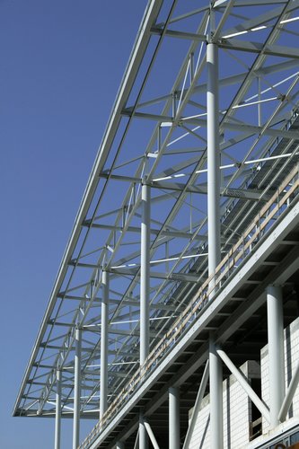 Zur Aussteifung der Dachkonstruktion werden sowohl in der oberen wie auch in der unteren Dachebene Verbände angeordnet. Die Horizontalstabilisierung des Daches gegen Wind- und Erdbebenkräfte erfolgt über die inneren Stahlstützen, die in 11 m Höhe - bei einer Gesamtlänge von 15 m - durch die vorfabrizierten Beton-Tribünenträger horizontal gehalten sind. Dabei ist zu beachten, dass die Steifigkeit der Tribünenträger in Querrichtung zehnmal grösser ist als in Längsrichtung.
