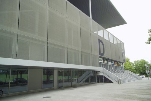Zeigten die Entwurfspläne zu Beginn noch ein spannungsreiches Arrangement von Stadionoval und Baukörpern für die Nebennutzungen, das von einem schwebenden Dach überfangen wurde, ist das ausgeführte Projekt deutlich kompakter. Stahlbetonstützen im regelmässigen Rhythmus tragen den viereckigen Dachkranz, der konstruktiv aus weit in Richtung Spielfeld vorkragenden Fachwerkträgern von 30 Metern Länge besteht und ursprünglich von innen verschiedenfarbig beleuchtet werden sollte. Ein auf der Südseite in die Arena hineingedrücktes Volumen enthält im vierten Obergeschoss an Firmen vermieteten Logen. Zwei Tribünen, die den strengen FFIFA und UEFA Richtlinien genügen müssen, fassen rund 32'000 Sitzplätze - wie heute üblich, wurde dabei auf grösstmögliche Nähe zum Spielfeld