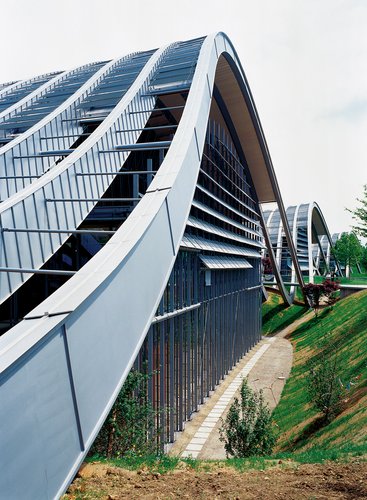 Die offizielle Bezeichnung Hügel bringt das Wesen des Bauwerks auf den Punkt: Es handelt sich hier nicht um ein Haus, sondern um ein Stück gebaute Topografie, oder wie es Renzo Piano nennt, um Terrainartikulationen. Beeindruckt vom vorgefundenen, weich bewegten Gelände mit dem kantigen Alpenmassiv im Hintergrund, wollte Piano ein Gebäude erschaffen, das Teil dieser Landschaft wird. Entstanden ist eine Abfolge von drei unterschiedlich grossen Erhebungen, die gegen Westen eine präzise Silhouette beschreiben, während sie auf den anderen Seiten kontinuierlich abflachen. Frühe Modelle vermitteln die Vorstellung, wonach die Landschaft als Teppich zu lesen sei, der an den Rändern nicht eben ist oder deshalb Deformationen aufweist, weil etwas darunter liegt. Die gebaute Realität sieht anders aus. Die Kontinuität zwischen natürlicher und künstlicher Topografie wird nicht über eine einheitliche Oberfläche erzielt – das Dach ist mit Blech eingedeckt –, sondern entsteht mittels Verschränkung. Damit sind in erster Linie die sichtbaren Rippen der Tragstruktur gemeint, die losgelöst von einer statischen Notwendigkeit bis zu mehrere Meter in das angeböschte Terrain hineinragen. Gitterroste und mit Erde gefüllte Blechtabletts, die zwischen den Rippen hängen, überspielen zusätzlich den Materialwechsel. In bester Camouflage-Manier werden die Konturen verwischt. Da scheint es nach einer ersten Irritation nur logisch, dass sich die Dachfläche im Frontbereich lichtet und freistehende Bogenträger zurücklässt.