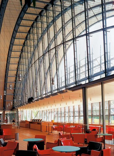Die unterschiedlichen Belastungen rühren daher, dass die Wölbung des Daches mit zunehmender Gebäudetiefe abnimmt. Und auch die Auflagersituationen variieren, denn die Welle ist nur in den vorderen Achsen ohne Unterbruch. Weiter hinten reichen die Bogen kaum über die jeweiligen Nutzungsblöcke hinaus, so dass rippenverstärkte Aussenwände die Funktion der sonst in den «Tälern» angeordneten Auflager übernehmen. Die Stahlbetonrippen dienen nicht etwa der Aufnahme des Erddruckes, sondern ermöglichen das Einspannen der Träger, wodurch der enorme Bogenschub im Verbund mit der Geschoss-, respektive Bodenplatte kurzgeschlossen wird. Das angrenzende Erdreich hätte nämlich die horizontalen Druckkräfte nicht aufzunehmen vermocht. Die Korrelation zwischen Bogenhöhe und Spannweite zeigt sich beim Zentrum Paul Klee in unterschiedlichen Schattierungen: Erforderten die flachen Wölbungen in den Hügeln Nord und Mitte sogar zwei Unterzüge, konnte umgekehrt an den bis zu 18 m hohen und maximal 63 m frei gespannten Front-Bogen die Glasfassade aufgehängt werden. Allerdings bewirken deren Last und die hohen Momente am Fusspunkt des Trägers, wo die Bogenlinie noch vor Erreichen des Auflagers zur Gegenbewegung ansetzt, dass die Profilform vom I zum Kasten wechselt und die Steghöhe zunimmt – von 80 cm am Scheitel zu 120 cm beim Auflager. Die Querschnittsveränderung fiele noch deutlicher aus, wären die Träger nicht ohnehin schon höher als statisch erforderlich. Die «Überdimensionierung» geht auf den Wunsch zurück, die Tragstruktur sowohl innen als auch aussen zu zeigen. Das Trapezblech, auf dem eine 28 cm dicke Wärmedämmung und eine Dachhaut aus Chromstahl liegt, ruht deshalb nicht auf dem unteren Flansch, sondern auf einer Leiste, die oberhalb des Flansches angeschweisst ist.