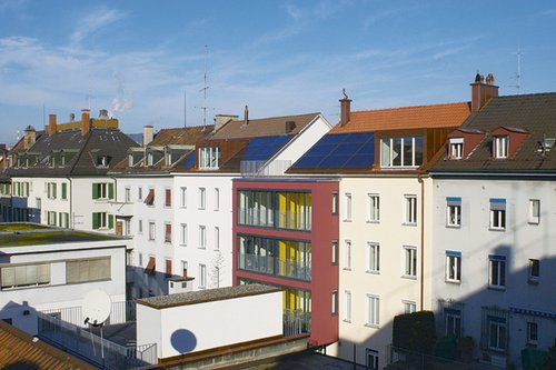 Minergie-P, ein damals noch völlig neuer Standard, war für das Planungsteam das erklärte Projektziel. Neben neuen Fenstern mit einem U-Wert von 0.9W/m2K wurden die Aussenwände mit Steinwolle gedämmt: die Hoffassade 20cm, das Dach 40cm, der neue Mittelbau 24cm und die Strassenfassade schliesslich 16cm. Diese Unterschiede haben (bei den Wänden) keine bauphysikalischen Gründe, sondern baurechtliche. Bei Sanierungen dürfen nämlich lediglich 15cm des Strassenraumes beansprucht werden. Ganz offenkundig ist Miner- gie-P noch nicht bei den gesetzgebenden Instanzen angekommen!