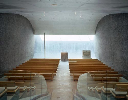 Eine Wegkirche, so wie bei Rudolf Schwarz (auch ein Gläubiger). Draussen beginnt der Weg auf dem ausgreifenden, kirchenbreiten Vorplatz, der sich wie ein erstarrter, breiter Betonstrom vom Eingang her leicht absteigend gegen die Ankommenden wälzt. Noch hat man das Gefühl, man gehe auf einen Ausstellungsraum zu, dann betritt man das dreiseitig raumhoch verglaste Foyer. Ein kühler Ort, wo man begrüsst, herumsteht und schwatzt. Doch man ist erst darunter, noch nicht drin, denn der auskragende Schwung des Vordachs (des Flaschenhalses?) fährt mit wuchtiger Eleganz über die Köpfe hinweg und stoppt mit einem schmalen, liegenden Fenster, das aber am Foyer keinen Anteil hat. Das Foyer ist auf seiner vierten Seite ausgerundet, die senkrechte Wand löst auf und geht mit einer Kurve vom Boden in die Decke über. Hier macht der Weg eine Pause und endet an einem schwungvollen Betonfels. Aber nur kurz, denn in der Gebäudeachse liegt der Durchlass zum Kirchenraum, eine Verengung und Kanalisierung. Die Stimmung ändert sich vom Profanen zum Sakralen, niemand schwatzt mehr. Im Zugangskanal wird es dämmrig, aber die Altarwand, auf die man geradeaus blickt, leuchtet als helles Band dem Besucher entgegen. Davor steht der blockhafte, hinterleuchtete Altar. Wie schon im Foyer geht der Boden in sanftem Schwung in die Altarwand über und sie verschwindet hinter der Deckenkante. Denn von oben senkt sich die Decke dem Altar entgegen und zwischen Wand und Decke bleibt ein Abstand, in dem auf die ganze Raumbreite ein unsichtbares Oberlicht sitzt. Die Altarwand wird mit Streiflicht aus einer verborgenen Quelle belichtet, ein altes barockes Verfahren.